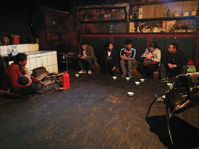 图为:调研人员在县、乡干部陪同下,深入木协乡村民家中调研,该家庭异常贫寒,灶台前的空地是一家人晚上休息和睡觉的地方。