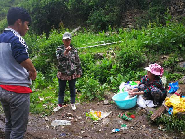 图为:本地村民家中经常没电,没有洗衣机,只得到村外小溪边清洗衣物。