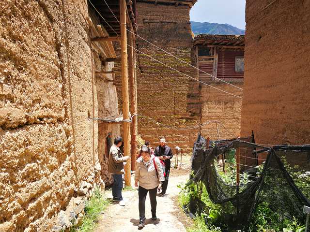 图为:调研人员深入村民居住院落实地考察,村民常年隐居大山深处,对外来人员感到十分好奇