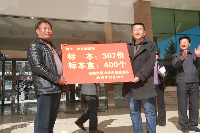 2015年11月10日下午,我院向林芝市朗县藏医院捐赠50余万元药用植物标本(标本307份、标本盒400个),捐赠仪式在我院第二实验楼前举行。学院副院长郑维列出席仪式并讲话,我院食品科学学院、林芝市卫计委、林芝市藏医院、朗县县委等单位相关领导及我院中(藏)药资源普查队全体成员参加捐赠仪式。