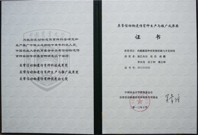 2013年10月27—31日,在中国畜牧兽医学会动物遗传育种学分会主办、四川农业大学承办的第十七次全国动物遗传育种学术讨论会上,我院强巴央宗教授主持的“西藏藏猪种质资源挖掘与开发利用”成果,获得了“中国农业大学教育基金会吴常信动物遗传育种奖励专项基金”第三届吴常信动物遗传育种生产与推广成果奖,这是我院首次荣获此殊荣,也是第三届吴常信动物遗传育种生产与推广成果奖仅有的两项获奖成果之一。