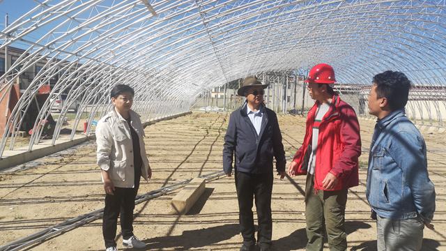罗玛镇副镇长罗布和现场施工负责人介绍了温室的修建情况,目前温室整体骨架搭建已接近完成,施工用材均为优质钢材、操作规范、内外骨架平整、整体结构结实牢固,计划10月1日前全面完工,交付使用。张齐兵询问了项目实施过程,建议考虑在温室中进行科研试验的设施建设。罗红英强调了温室修建的质量和进度保证,并对今后如何使用好该新型温室提出了建议。
