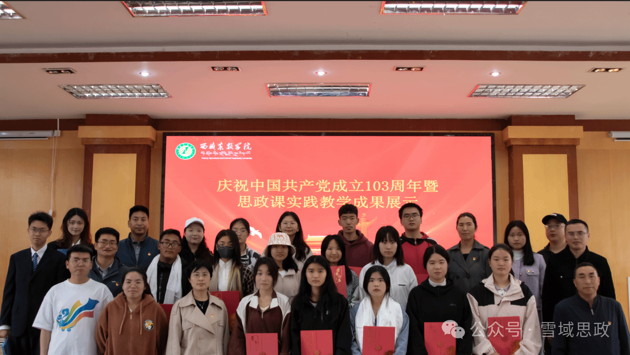 为深入学习贯彻党的二十大精神,落实习近平总书记对学校思政课建设的重要指示精神,深入推进我校思想政治理论课实践教学改革创新发展,扎实提升思政课铸魂育人成效,学校教务处联合党委宣传部以铸牢中华民族共同体意识为主线,举办庆祝中国共产党成立103周年暨思政课实践教学成果展示活动。通过课上集中学习、课后查阅资料、小组讨论、编排作品、制作视频等方式对所学知识进行艺术创作,利用思政课集中展示、评比作品。思政课教师在此过程中对每个参赛作品进行点评、总结并引导学生深入思考所学知识,奋力书写为中国式现代化挺膺担当的青春篇章。