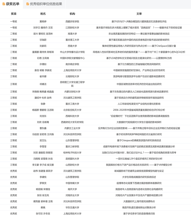 最后,本次数据研究与应用大赛,经过专家评审,共评选出一等奖2名、二等奖8名、三等奖15名、优秀奖8名(获奖通知网址:https://data.cnki.net/jingsai/resultsPublication)。其中,我校水利土木工程学院的黄艳婷同学脱颖而出,凭借“基于GIS与CF-LR耦合模型的川藏铁路泥石流易感性评估”这一文章荣获本次大赛的一等奖。获奖名单公示如下: