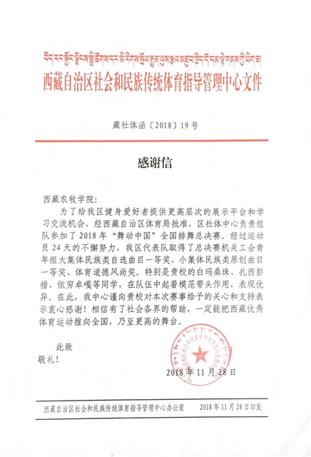 本次比赛充分展示了我院学子良好的精神面貌和精湛的舞蹈技巧,向全国展示了西藏人民美好的幸福生活。赛后,西藏自治区体育局副局长刘君柱同志,向全体队员表示祝贺,刘局长赞扬同学们吃苦耐劳的精神,充分肯定同学们的训练成果,同时感谢西藏农牧学院的大力支持配合。
