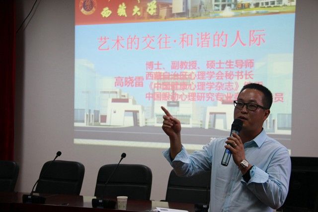 高晓雷副教授是西藏大学本土的心理专家,他于9月23日晚7点带来“艺术的交往、和谐的人际”主题讲座。高教授首先讲的是做人,德行是立人之本;然后讲做事,需要具备哪些能力;最后提要求,和谐的人际我们能掌握的是去学习哪些技巧。高教授分享了他成功的心理准备和能力准备,生活和工作当中的点滴感悟,他质朴的语言、殷切的期望,脚踏实地的学习工作精神,鼓舞了在场的师生,师生们受益良多。