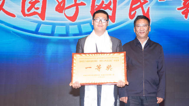 区党委网信办副主任索朗顿珠为获一等奖的参赛队颁奖