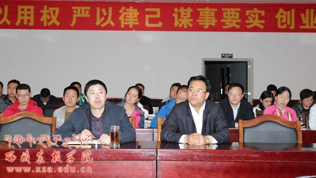 2017年5月26日下午,我院在一号行政楼中心会议室举办院直机关单位“四讲四爱”宣讲报告会,院党委书记、副院长云丹加措,院党委委员、副院长郭永刚、翟新验,院长助理李卫星出席,全院直属机关单位科级及以上干部共计70余人参加报告会。本场报告会邀请院“四讲四爱”主题教育实践活动宣讲团成员、宣传部思想政治理论课教研室主任王国新教授作专题报告。报告会由“四讲四爱”主题教育实践活动领导小组办公室主任、院党委宣传部部长巴桑次仁主持。