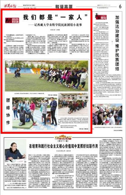 自2016年7月以来,西藏日报相续以《校园里—— 民族团结氛围浓厚》、《我们都是“一家人”——记西藏大学农牧学院民族团结小故事》、《只为民族团结一家亲 ——记西藏大学农牧学院援藏干部李家奎》为题,对我院民族团结建设成果进行报道。 请单击浏览: