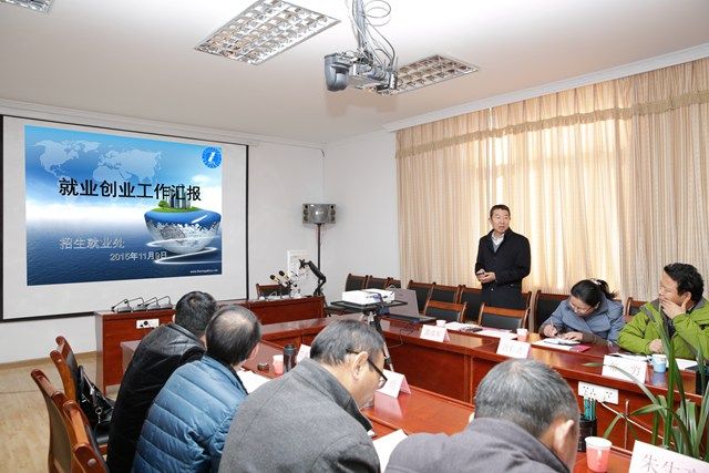 随后,我院招生就业处主要领导从工作保障、课程建设、就业创业服务及存在问题等方面作了《深挖内涵 逐步完善就业创业体系》的汇报。
