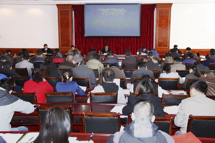 2015年10月23日,我院隆重召开学生工作大会,全面回顾近年来我院学生工作,总结经验、查找不足,积极探索新形势下学生管理工作的特点和规律,明确下一步的工作思路和举措,进一步巩固和扩大学生教育、管理、服务工作成果。院党委副书记、院长次旦平措出席大会并讲话。副院长郑维列主持大会。院党委委员、副院长周顺利作学生工作报告。学院领导赵垦田、郭永刚、周宏力,各职能部门、二级学院(部)有关负责同志,全体专职辅导员,部分班主任及学生代表参加大会。