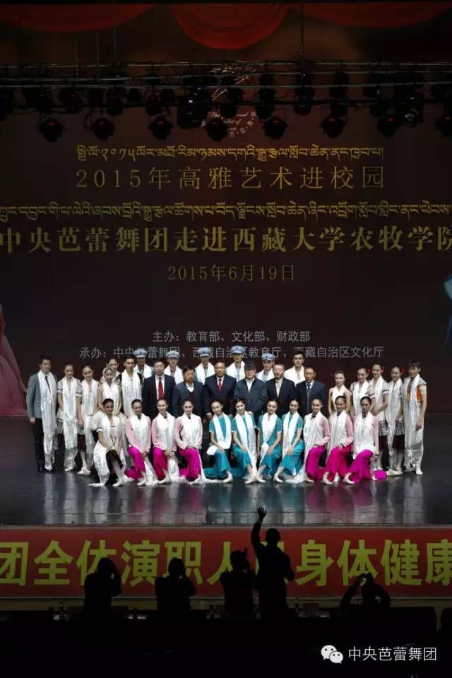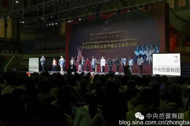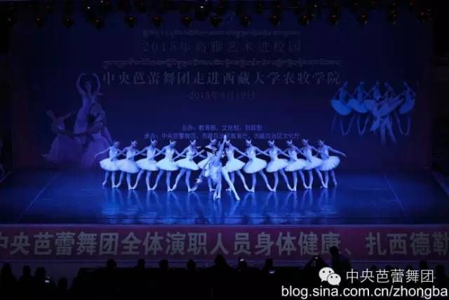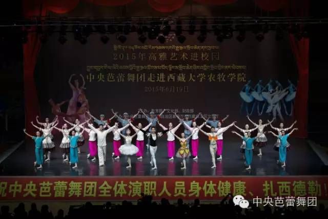 中芭在西藏的首秀创下了“高雅艺术进校园,走进芭蕾”演出史无前例的记录,长达2个多小时。而为表达对中央芭蕾舞团的欢迎和感谢之情,在正式演出前和演出过程中,农牧学院大学生艺术团也穿插献上演了《春满林芝》、《桃花深处》、《牧场欢歌》等三段极具西藏民族特色的舞蹈。藏族服饰充满民族特色,嘹亮高亢的音乐,豪迈挥洒的锅庄,淳朴的民风,热情的舞步,这一切似乎是对中芭艺术家在林芝停留几天来所见所闻的完美诠释。这个舞台不仅是艺术的展示,也是心与心的交流,舞台上是多元民族文化通融共鸣,相得益彰。而这些“会说话就会唱歌,能走路就能跳舞”的藏族同胞,充分发挥能歌善舞的天赋,让远道而来的中芭艺术家大开眼界。