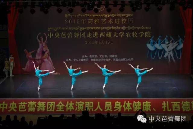 林芝的六月,气候宜人,正是一年中最美好的时节,这一天恰逢西藏自治区林芝地区“撤地建市”的大喜日子,同样,这一天对中芭人来说也是一个大喜日子,在雪域高原青年学子的热切期盼中,由国家教育部、文化部、财政部三部委联合主办、中央芭蕾舞团、西藏自治区教育厅和文化厅联合承办的“2015高雅艺术进校园——走进芭蕾”之“中央芭蕾舞团走进西藏大学农牧学院”在这个培养无数藏汉干部的著名高等学府此拉开帷幕。