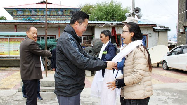 纪建洲非常关心驻村队员的身心健康,向驻村队员敬献了哈达,为驻村队送去猪肉、蔬菜、粮油等生活用品和慰问金,让驻村队员倍感组织的关怀和温暖。纪建洲一行实地查看了村容村貌、农作物生长情况,检查了朗多村温室大棚项目、娘龙村农家乐项目和联合收割机使用情况。