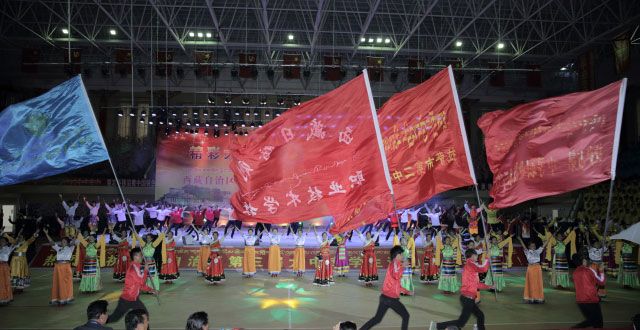 晚会最后,次旦平措交出全区大中专学生运动会会旗,刘伯清将会旗传递给全区第四届大中专学生运动会承办单位西藏职业技术学院。