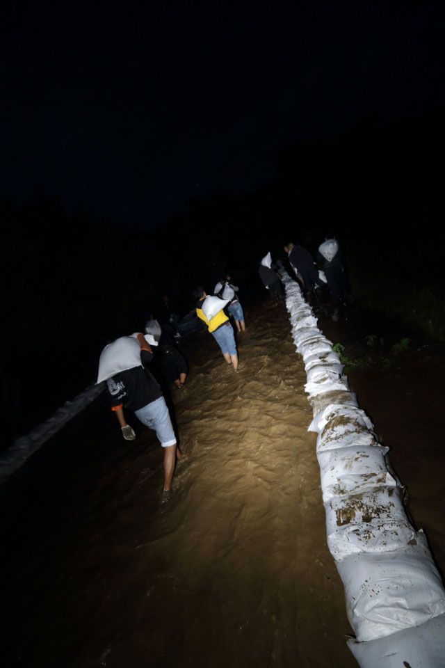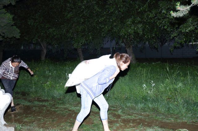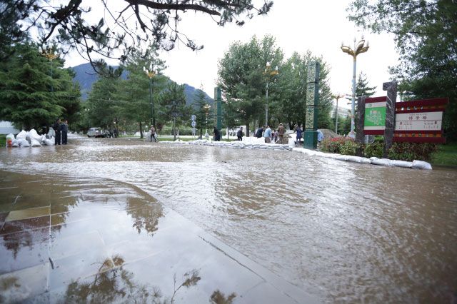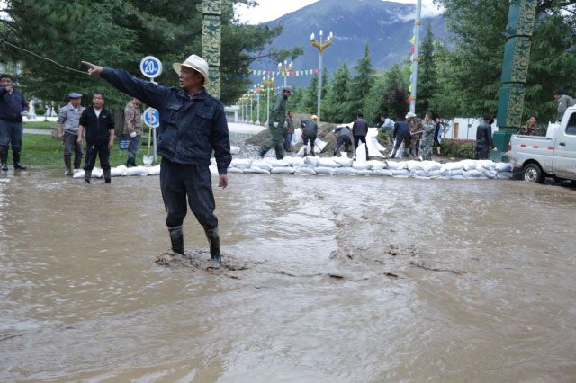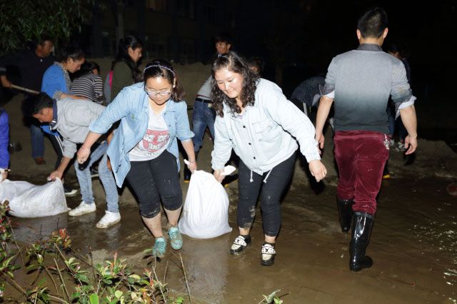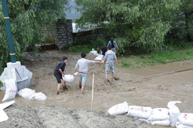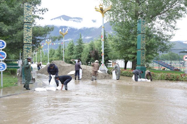 为积极应对学院后山炮连附近发生泥石流引起的校园洪灾, 7月15日晚,我院广大教职员工在院党委副书记、院长次旦平措,院党委委员、副院长琼日的带领和指挥下,穿着胶鞋,挽起裤腿,装沙袋、挖淤泥、改水道,一个个干得热火朝天。各单位领导干部和广大党员身先士卒,积极应对湍急的水流。夜渐深,但抗洪抢险的热情丝毫未减,部分学生也自觉加入到抗洪行列当中。