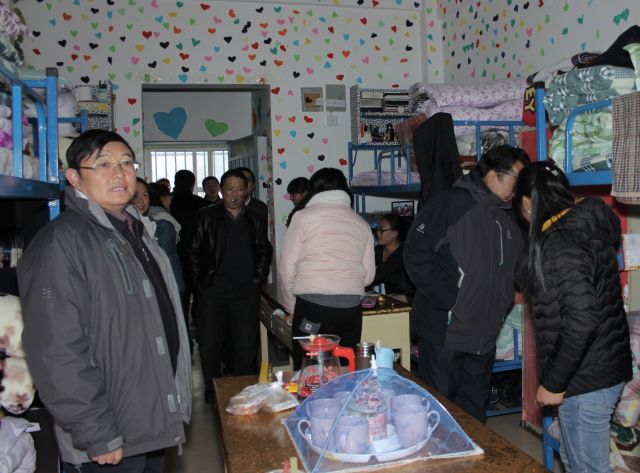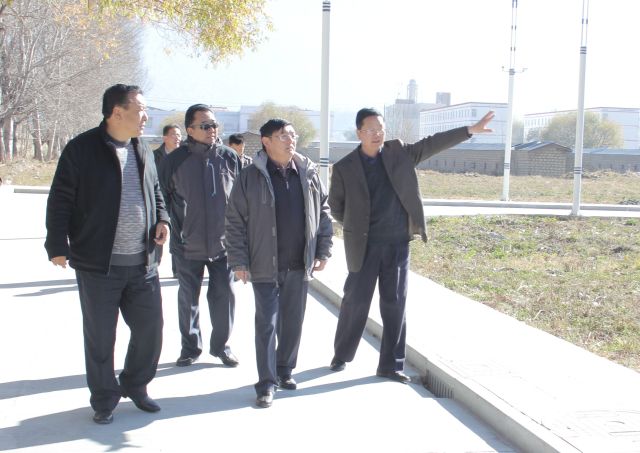 视察职工住宿区(前排右二为自治区教育工委副书记、教育厅厅长马升昌)
