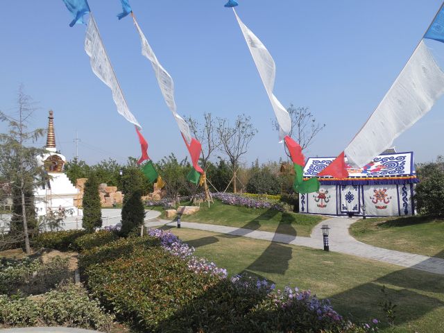 西藏展区由外展区(西藏园)、内展区(西藏展厅)两部分组成。整个设计中,遵循第八届中国花卉博览会“幸福像花儿一样”的设计主题,以“高原奇葩,秘境西藏”为西藏展区设计理念,进行了整体规划设计。其中,“西藏园”以西藏园林景观为基础,以松、柏、榆、竹等为背景,借助藏式门楼、白塔、转经廊、边玛墙、经幡阵、藏式帐篷等西藏特色园林小品进行布局,营建了西藏特色园林景观,展出了以西藏野生花卉为亲本的栽培花卉的丰富资源;“西藏展厅”则以传统藏家客厅为题材,在全国首次展出了大花黄牡丹、馥郁滇丁香、尖子木、小果紫薇、乔木刺桐等西藏珍稀濒危名贵野生花卉资源。