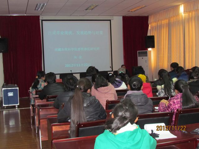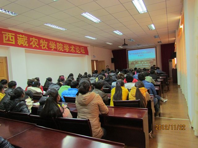 院庆当天下午,华中农业大学博士生导师李家奎教授、西藏自治区农科院畜牧兽医研究所畜牧研究室主任央金研究员在图书馆学术报告厅分别作了题为《牦牛疾病防控研究进展》、《西藏羊业现状发展趋势与对策》两场解析十八大报告专题学术讲座。报告为我区各族人民贯彻落实十八大精神,促进西藏特色畜牧业健康、持续、快速发展,实现西藏经济总量翻一番,进而全面实现小康,打造资源节约型、环境友好型新西藏提出了可行性思路和意见。专家们生动形象、深入浅出的讲解使大家深受启发、受益匪浅,为我院师生带来了不同领域的最新声音。我院百余名师生参与了报告与交流。