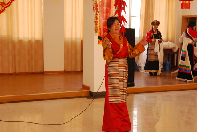 多才多艺的教职工们献上了舞蹈、独唱、合唱等精彩节目,热情的观众为登台演出的教职工们敬献哈达,以表达淳朴的敬意和祝福,节目中穿插的猜灯谜、投掷彩球等小游戏,增添了不少乐趣,团拜会现场热闹非凡。最后,学校领导与教职员工们一同跳起欢快的锅庄,把活动推向了高潮,欢声笑语弥漫在整个校园,我校教职员工们共同度过了一个欢乐、祥和、喜庆的藏历新年。