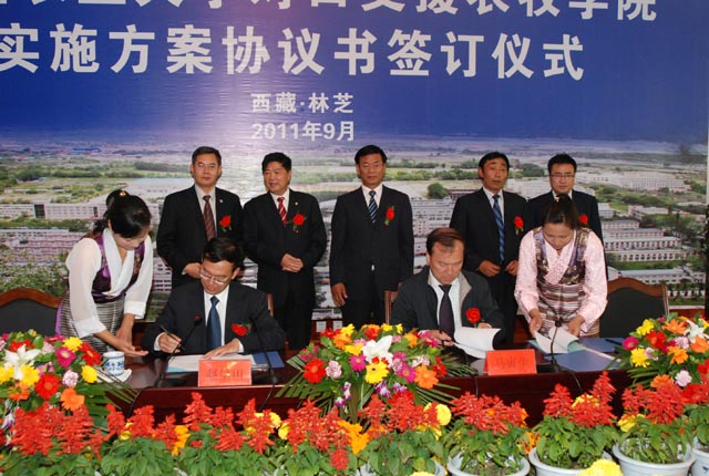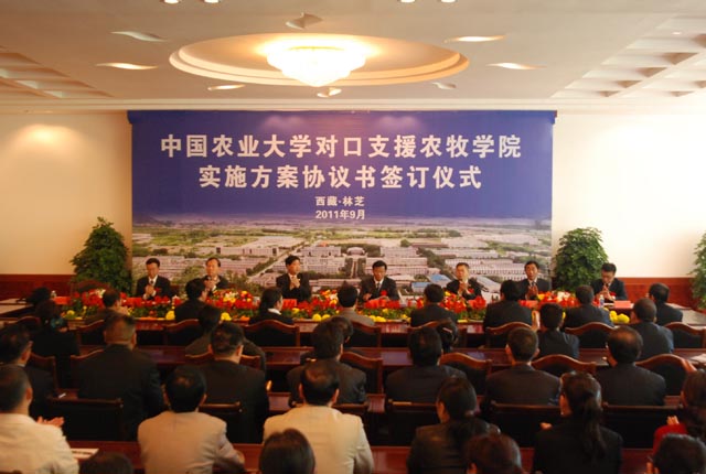 2011年9月1日,中国农业大学党委书记瞿振元、中国农业大学副校长马寅生一行在西藏自治区教育厅副厅长康凯的陪同下莅临我院,与我院就下一步对口支援工作进行了全面深入的商谈,并与我院签订了《中国农业大学对口支援农牧学院工作协议书(2011-2015)》。