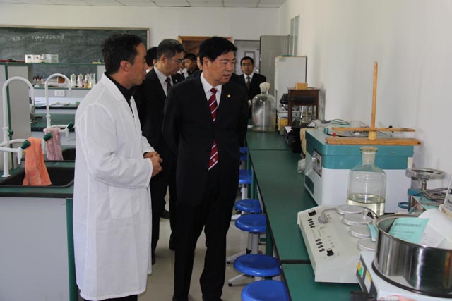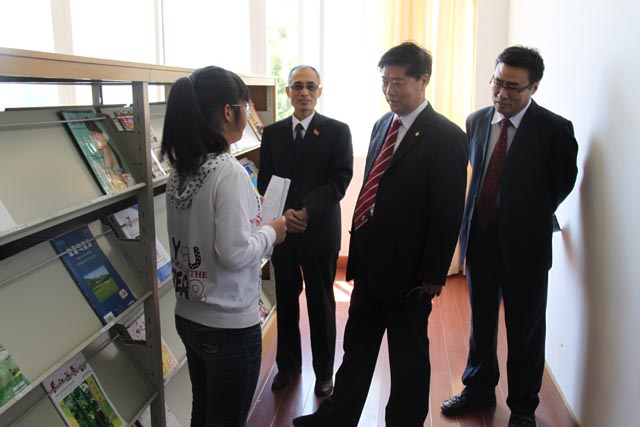 随后,瞿振元书记一行在桑珠书记和康凯副厅长陪同下,实地考察了我院植物科学学院、动物科学学院、资源与环境学院、食品科学学院和生物技术中心相关实验室建设情况,详细了解实验室仪器设备及科研项目申报和进展等情况,与实验室的教师亲切交谈,鼓励他们积极努力,争取继续深造,并表示,中国农业大学将给予全力支持。瞿书记还勉励他们注重与硕士生(博士生)导师的联系与合作,充分利用内地高校的优秀人才和先进设备等资源,以西藏丰富的特色优势资源为依托,共同推动科学研究迈上一个新台阶。瞿书记一行还参观了我院学生活动中心和图书馆。瞿振元书记看了我院的藏书后当即表示,今后中国农业大学出版社出版的每种书籍都将送给我院图书馆5份,之前出版的也会从库存中送给我院。