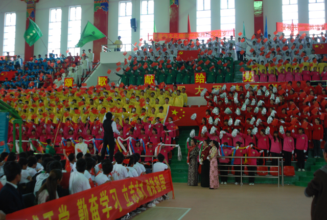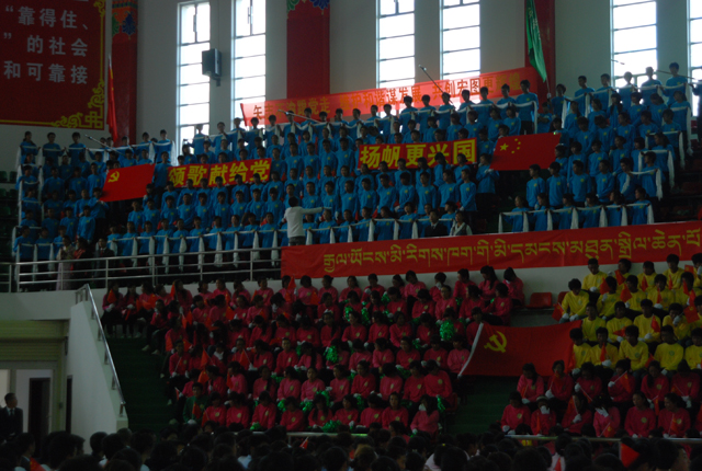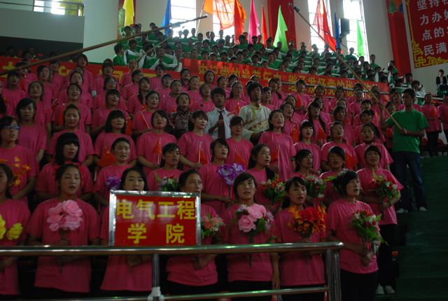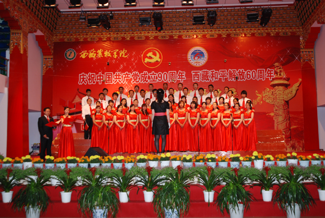 26日下午5时开始的学生组歌咏晚会更是盛况空前,将我院庆祝中国共产党成立90周年和西藏和平解放60周年系列活动推向了高潮。晚会独特新颖地引用了毛主席宣布“中华人民共和国成立了”的原声重现作为教工合唱团表演曲目的开场,使在场的师生倍感亲切、深受鼓舞。随后,6个二级学院的学生方队展开了热烈的红歌比赛,各队领诵激昂高亢、领唱清脆嘹亮、合唱铿锵有力,《游击队之歌》、《保卫黄河》将师生员工带回到烽火硝烟的战争年代,表现了革命先辈誓死捍卫祖国河山的无畏精神;《再唱山歌给党听》、《十送红军》带领师生回到推翻黑暗社会和落后制度的解放年代;《在希望的田野上》、《好日子》带领师生回到实践改革开放、与时俱进的崭新时代。各合唱队比赛的过程中穿插了舞蹈、诗朗诵、独唱、二重唱等文艺节目,使整台晚会精彩纷呈,高潮迭起,唱者激情饱满,听者心潮澎湃,师生们不时挥舞着手中的党旗、国旗、哈达和花束,鲜艳的五星红旗和党旗映照着一张张喜悦的笑脸,歌声此起彼伏,响彻整个体育馆,回荡在美丽的校园,汇成了一片欢乐的海洋。晚会结束时,全体师生员工起立齐声高唱《歌唱祖国》,将晚会推向了高潮。