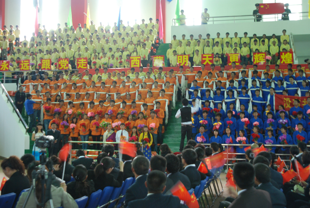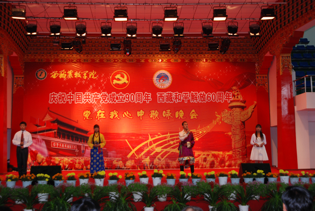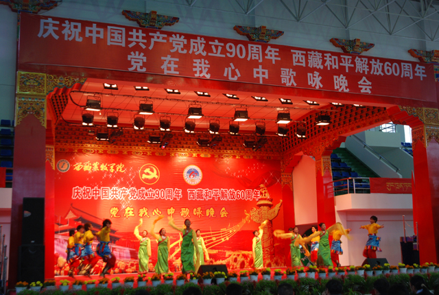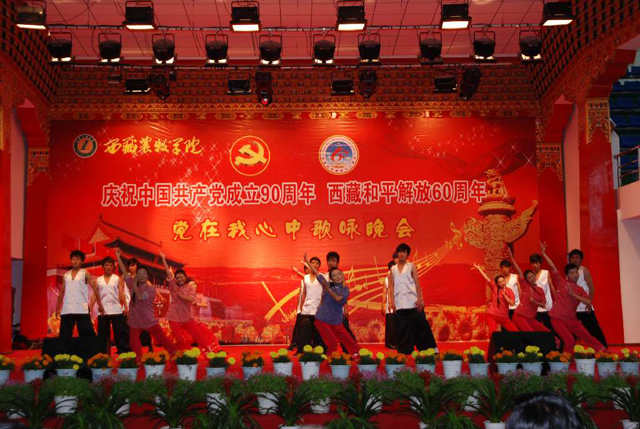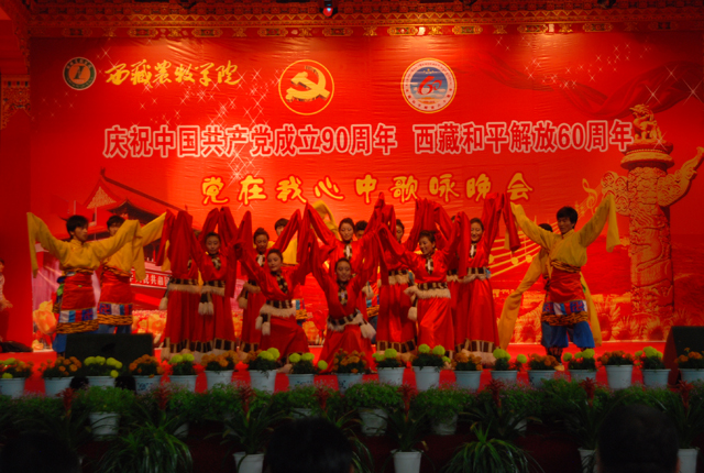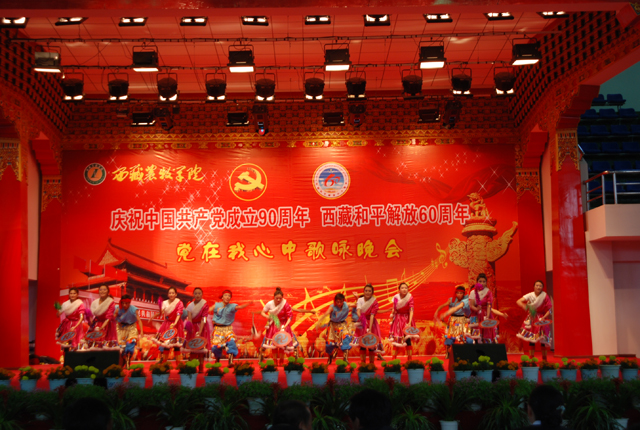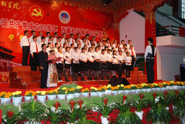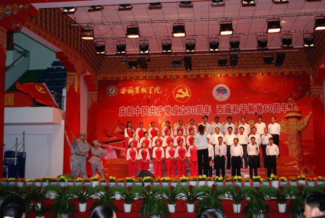 6月的农牧学院彩旗飘扬、鲜花盛开,处处洋溢着节日的喜庆氛围,全院师生员工身着节日盛装,怀着无比喜悦的心情,在体育馆隆重举行庆祝中国共产党成立90周年和西藏和平解放60周年“党在我心中”大型歌咏比赛活动。学院党政领导及林芝地区行署副专员顿吉出席并观看了演出,全院4000余名师生员工参与了演出活动,大家怀着无比激动的心情一同重温党的历史、传承红色精神,为鲜艳的党旗和国旗添上了浓墨重彩的一笔。