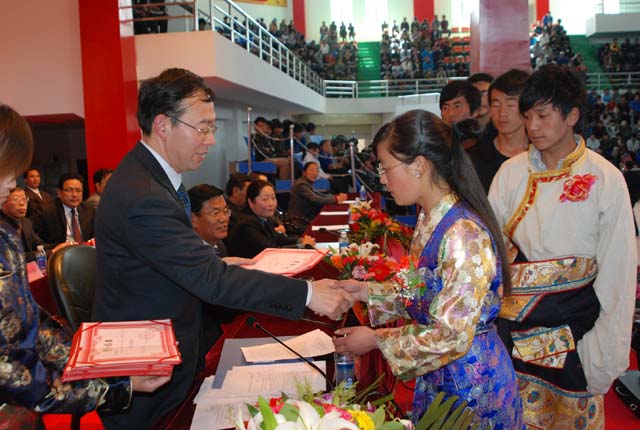 大会最后在热烈的气氛中举行了颁奖仪式,院党委书记、副院长桑珠与周秀英副院长、赵垦田副院长一起为获奖的集体和个人颁发了荣誉证书和奖金。大会在激昂的《中国共产主义青年团团歌》声中顺利结束。