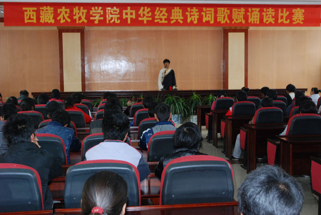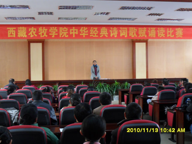 2010年11月13日上午,院成人教育培训楼会议室里,观众们聚精会神、全神贯注地倾听着一首首优美的中华经典名作,沉浸在选手深情的朗诵和优美的旋律中,西藏农牧学院中华经典诵读教工组和学生组比赛正在这里紧张进行。