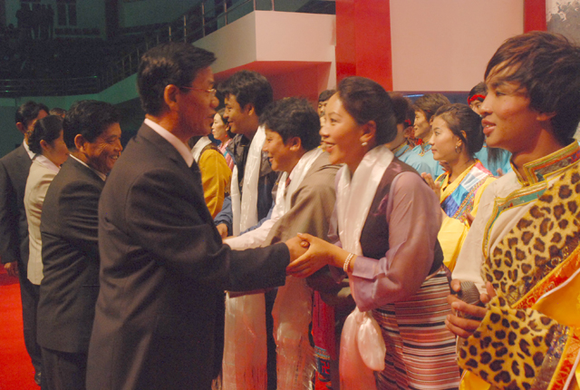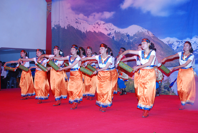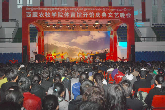 2010年9月9日晚,我院在新落成的体育馆隆重举行专场文艺晚会,热烈庆祝体育馆落成开馆、欢迎第六批援藏干部及2010级新生、庆祝第26个教师节。自治区藏剧团4位演员应邀前来我院,为我院师生员工献上了精彩的节目。学院党政领导、第六批援藏干部及全院师生员工共4000多人观看了演出,院党委委员、副院长周秀英在晚会上致辞。