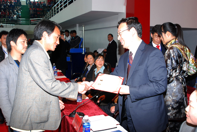 随后,桑珠书记做了热情洋溢的讲话。他首先代表院党委、行政向长期奋斗在教学、科研、管理、服务一线的教职员工表示亲切问候和崇高敬意,向2010届新生表示热烈欢迎,向获得表彰的先进集体和先进个人表示热烈祝贺,并代表院党委、行政向全院师生员工和新同学提出了四点希望:一是坚持学习中国特色社会主义理论体系,做中国特色社会主义共同理想的坚定信仰者;二是进一步坚定政治立场,全力以赴维护稳定,做祖国统一和民族团结的坚强捍卫者;三是勤奋学习,求实创新,打牢人生成长进步的根基;四是认真实践社会主义核心价值体系,注重品行锤炼,做良好社会风尚的积极倡导者。