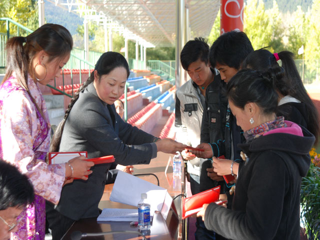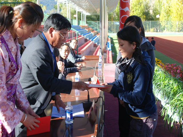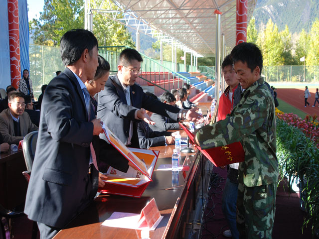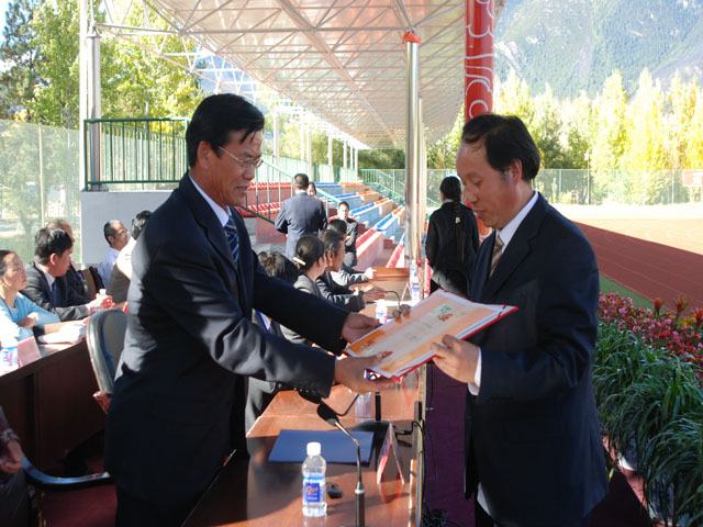 10月16日下午,学校在体育场隆重集会,召开维稳工作阶段总结暨新中国成立60周年爱国主义教育系列活动表彰大会。总结2009年来学校三个阶段维稳工作,安排部署今后维稳工作,表彰在学校举行的新中国成立60周年爱国主义教育系列活动中的获奖单位和个人。校党委书记、副校长桑珠、校党委委员、纪委书记公曲、副校长郑维列、校党委委员、副院长周秀英、校党委委员、副校长强巴多吉参加大会。大会由校党委委员、纪委书记公曲主持,党委书记、副校长桑珠同志作讲话,校党委委员、副院长周秀英同志宣读了《关于表彰庆祝新中国成立60周年爱国主义教育系列活动获奖集体和个人的通知》。