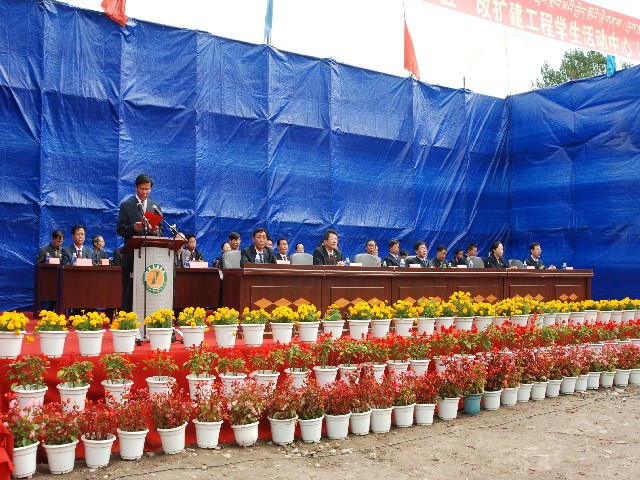 8月23日上午,我院隆重召开西藏自治区重点项目——农牧学院“十一五”改扩建项目学生活动中心(体育馆)开工典礼仪式。参加开工典礼仪式的领导有自治区教工委委员、教育厅副厅长杜建功同志、院党委书记、副院长桑珠同志、副院长郑维列同志、院党委委员、副院长周秀英同志、院党委委员、副院长强巴多吉同志、院党委委员、教务处处长赵恳田同志。全院县处级领导、全体教职工、部分学生代表以及项目承建单位代表和施工人员参加了开工典礼。院党委委员、副院长强巴多吉同志主持开工典礼仪式。
