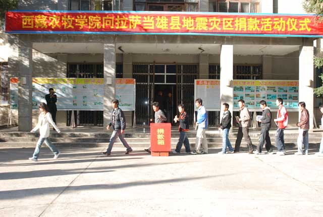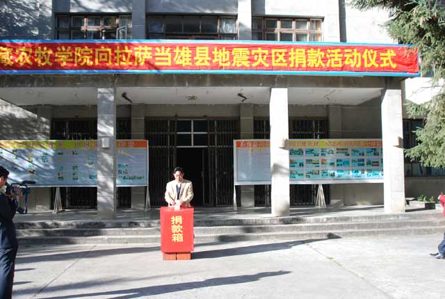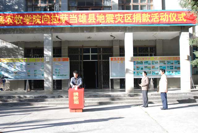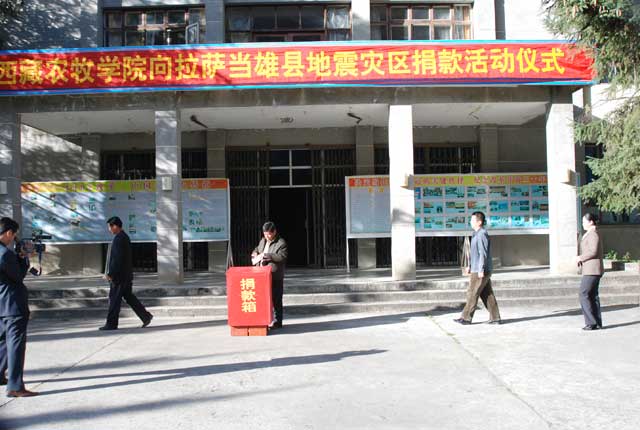 2008年10月6日,拉萨当雄县发生了6.6级地震灾害,给当地人民群众生命财产造成了重大损失。农牧学院党委和行政高度重视地震灾区救灾募捐工作,及时召开党委会议、各县处级单位党政一把手会议,认真传达区党委办公厅、区政府办公厅《关于开展为灾区人民送温暖献爱心活动的紧急通知》精神,对学院支援地震灾区捐款活动进行了专题研究和全面部署。