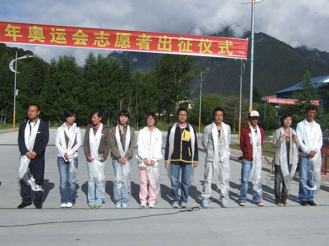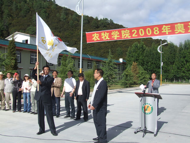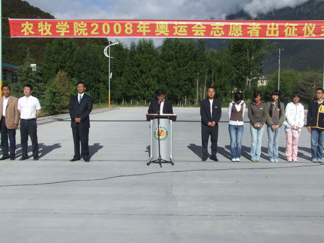 最后,院领导为志愿者们敬献了哈达,院党委书记、副院长桑珠同志将满载着农院人对北京奥运会无限祝福与期待的农牧学院志愿者旗帜交给了志愿者。随后,志愿者们在欢快的牦牛舞和哈达舞中坐上汽车,踏上了奔赴拉萨、再赴北京的征程。