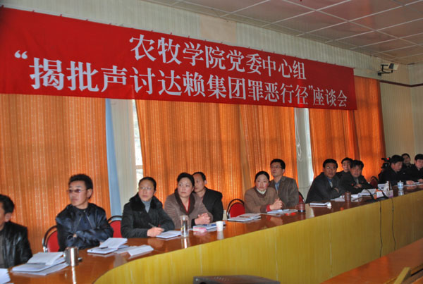 4月22日下午,院党委中心组组织召开“揭批声讨达赖集团罪恶行径”座谈会。并观看《西藏的蓝天》专题片。之后,来自各党总支、直属党支部的领导16位同志从历史和现实的不同角度,纷纷揭批达赖集团所犯下的滔天罪行。