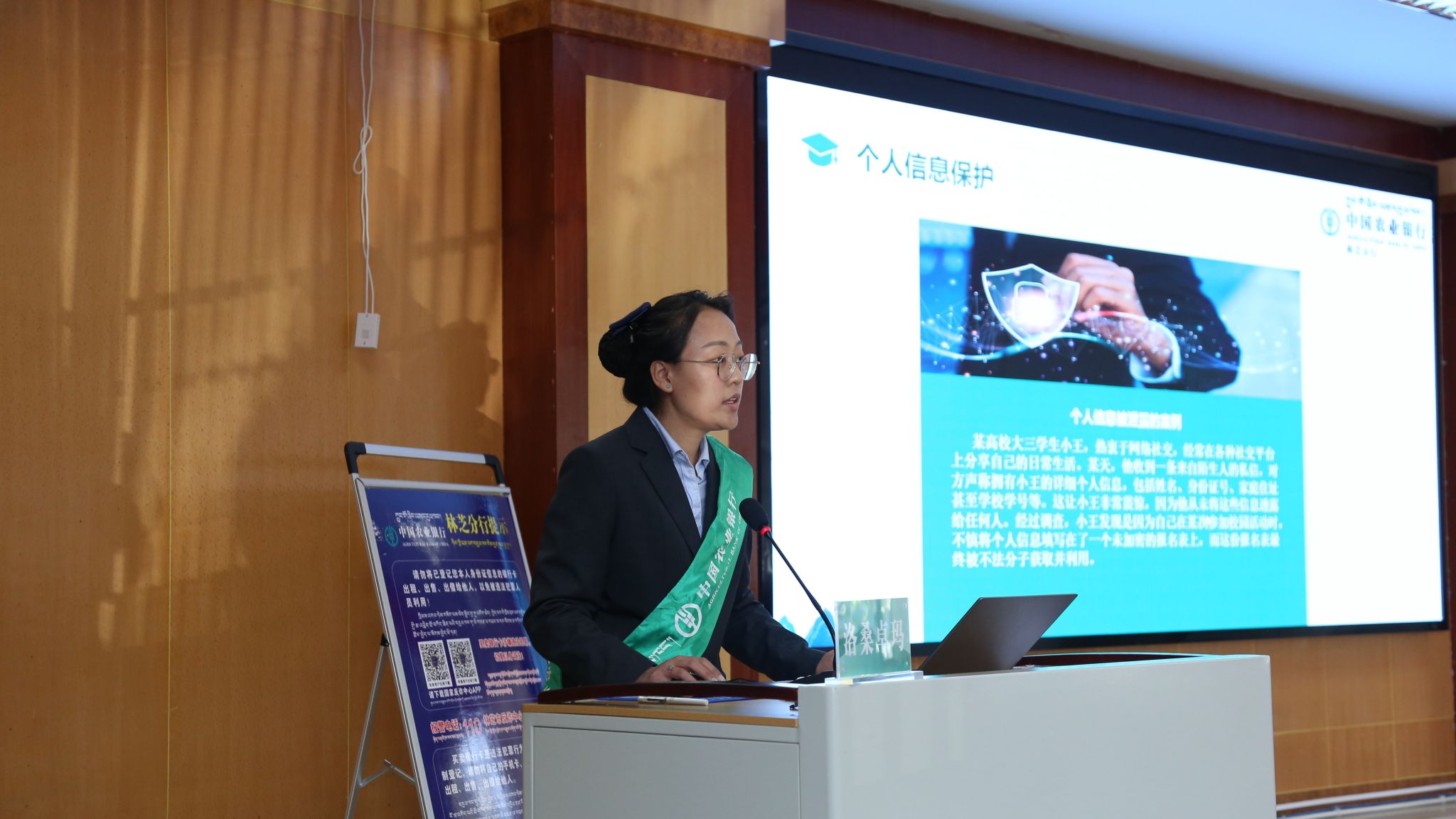 会上,农行林芝市分行个人金融部洛桑卓玛用通俗易懂的言辞深入细致地讲解金融消费者权益、个人信息保护、银行卡用卡安全、个人征信业务等金融防护内容;