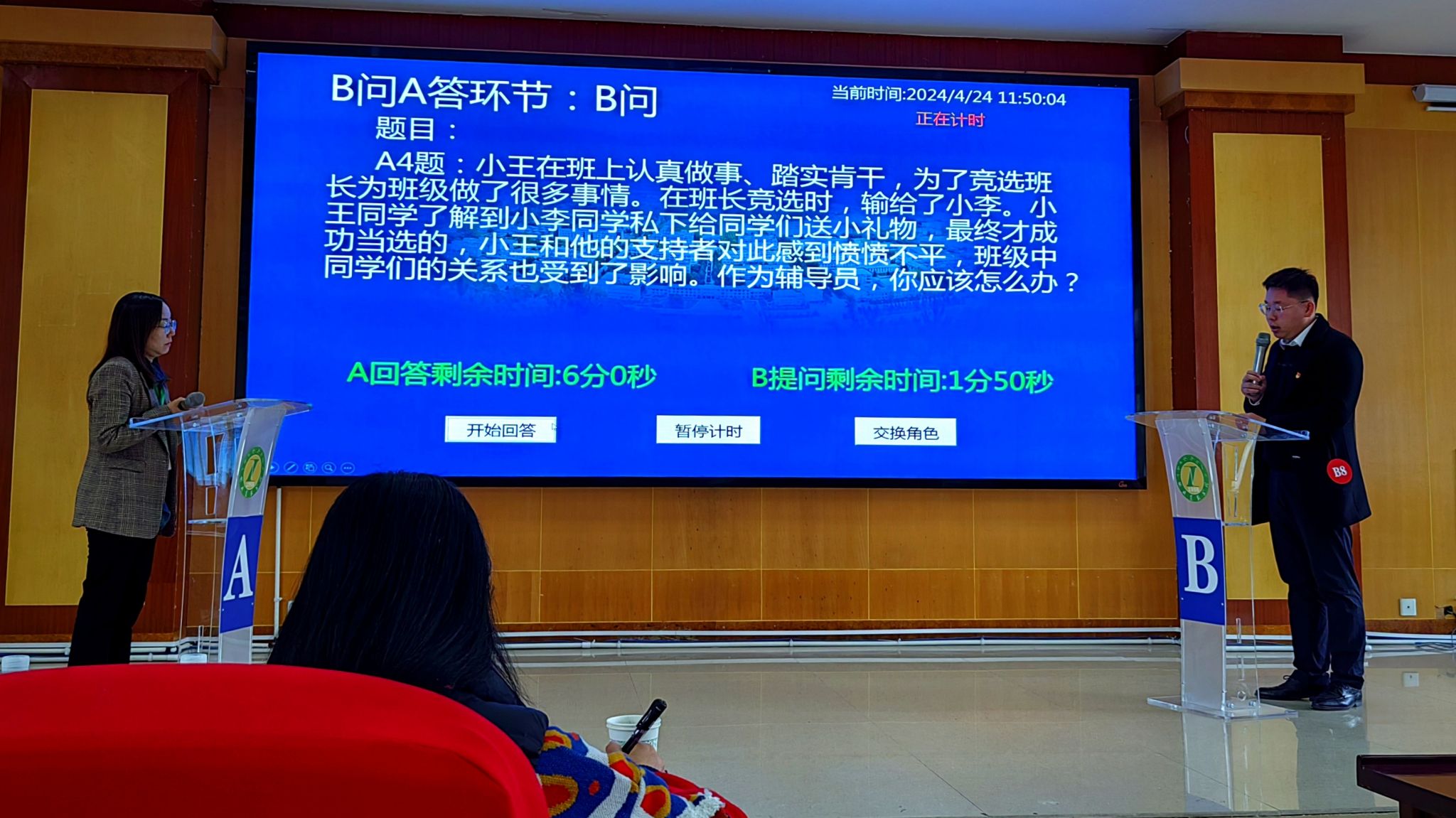 案例研讨环节以“我提问,你回答”的方式开展,主要考察辅导员综合运用理论分析问题、研判问题、解决问题的能力。在“一问、一答”的过程中,选手们针对案例,展现扎实的理论功底和丰富的知识储备,以及良好的现场应变和逻辑思辨能力,最终12位选手进入谈心谈话环节。