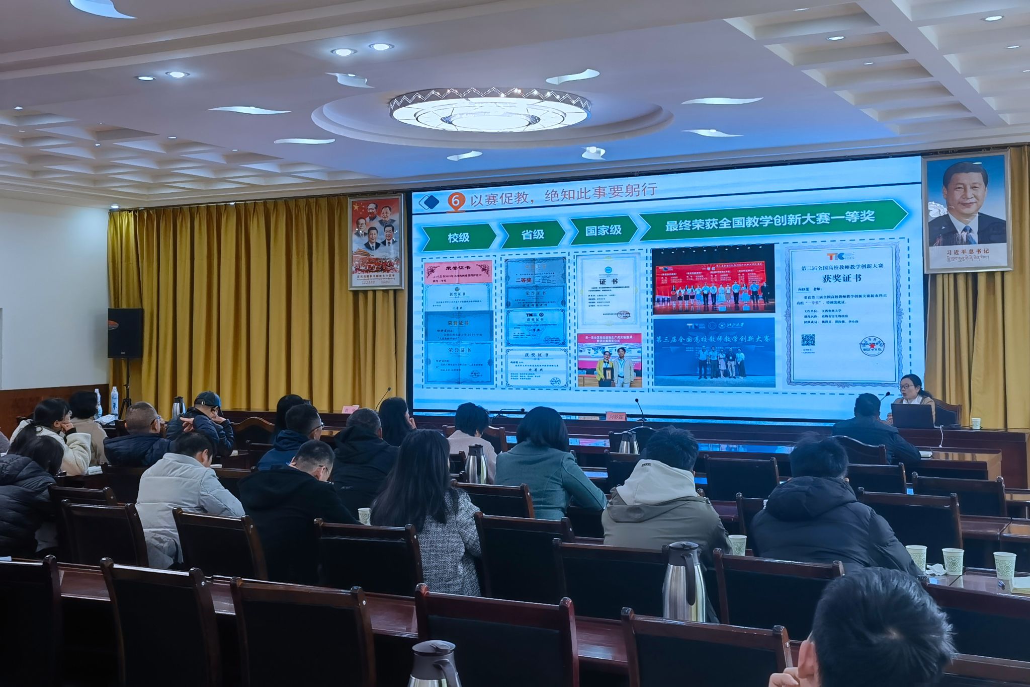 为充分发挥全国高校教师教学创新大赛示范带动作用,积极引导广大教师投身教育教学改革,更好适应高等教育发展新形势、新任务、新要求,不断提升人才培养质量。5月3日上午,教务处在学校中心会议室组织召开教师教学能力提升和教学方法创新培训讲座。全国高校教师教学创新大赛国赛一等奖获得者臧红彬教授、向妙莲教授以及袁敏副教授应邀作报告。讲座由学校教学督导委员会主任黎普明主持,各教学单位教师代表60余人参加讲座。