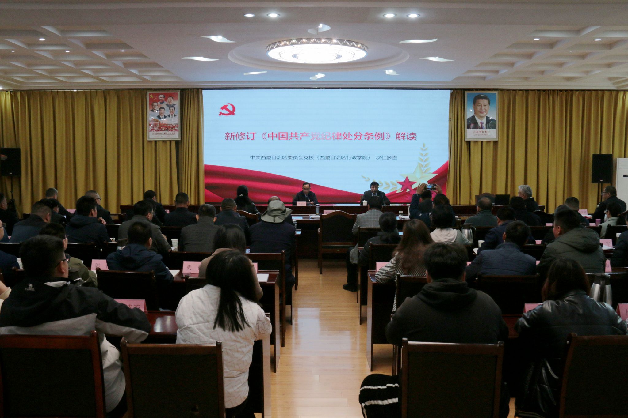 为扎实推进党纪学习教育,教育引导全校广大党员深刻理解新修订的《中国共产党纪律处分条例》(以下简称《条例》)的重要意义、准确把握《条例》修订的主旨要义、切实抓好《条例》的贯彻执行,5月17日,我校邀请自治区党委党校(行政学院)党史党建教研部主任、副教授次仁多吉作《条例》解读专题辅导讲座。讲座由学校党委书记、副院长娄源冰主持。在校的党委班子成员、县处级干部,以及学校基层党支部书记、教师党员、学生党员、离退休党员代表参加讲座。