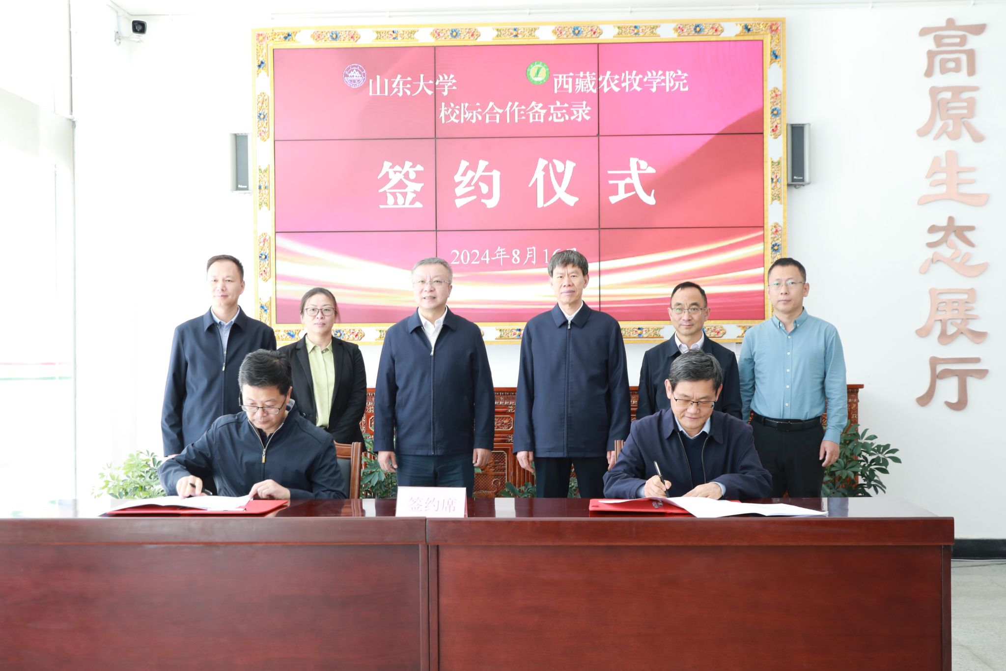 8月16日,《山东大学 西藏农牧学院校际合作备忘录》签约仪式在西藏农牧学院举行。西藏自治区副主席郎福宽,山东大学党委书记任友群,西藏自治区教育厅党组副书记、厅长党静,西藏大学党委副书记、校长金永兵,西藏农牧学院党委书记、副院长娄源冰,林芝市委常委、副市长玉珍,西藏大学党委常委、副校长王斌礼,西藏大学党委常委、副校长方江平出席活动。山东大学党委副书记陈宏伟,西藏农牧学院党委委员、副院长巩同梁分别代表双方签署校际合作备忘录。签约仪式由西藏农牧学院党委副书记、副院长苏大鹏主持。