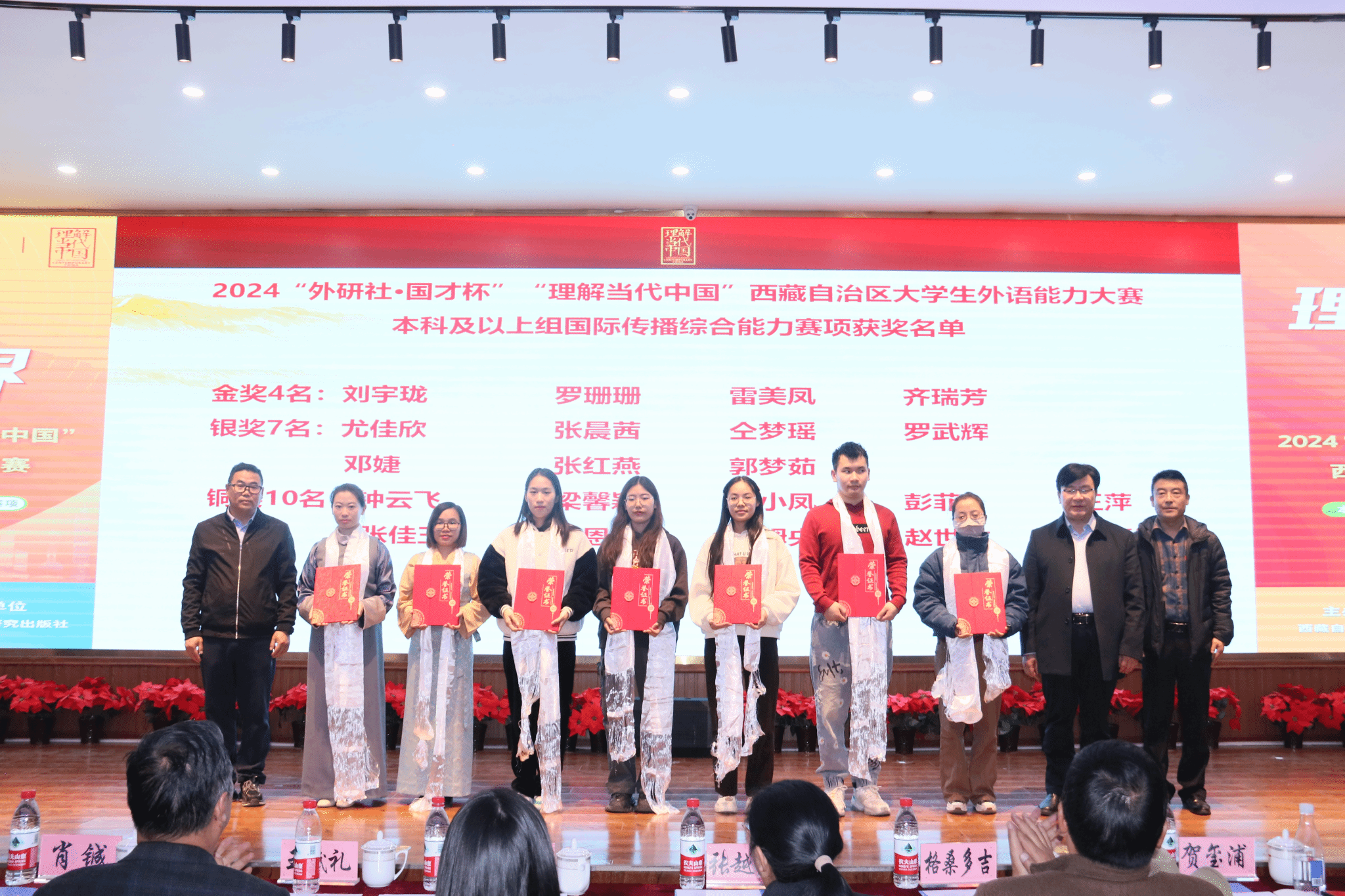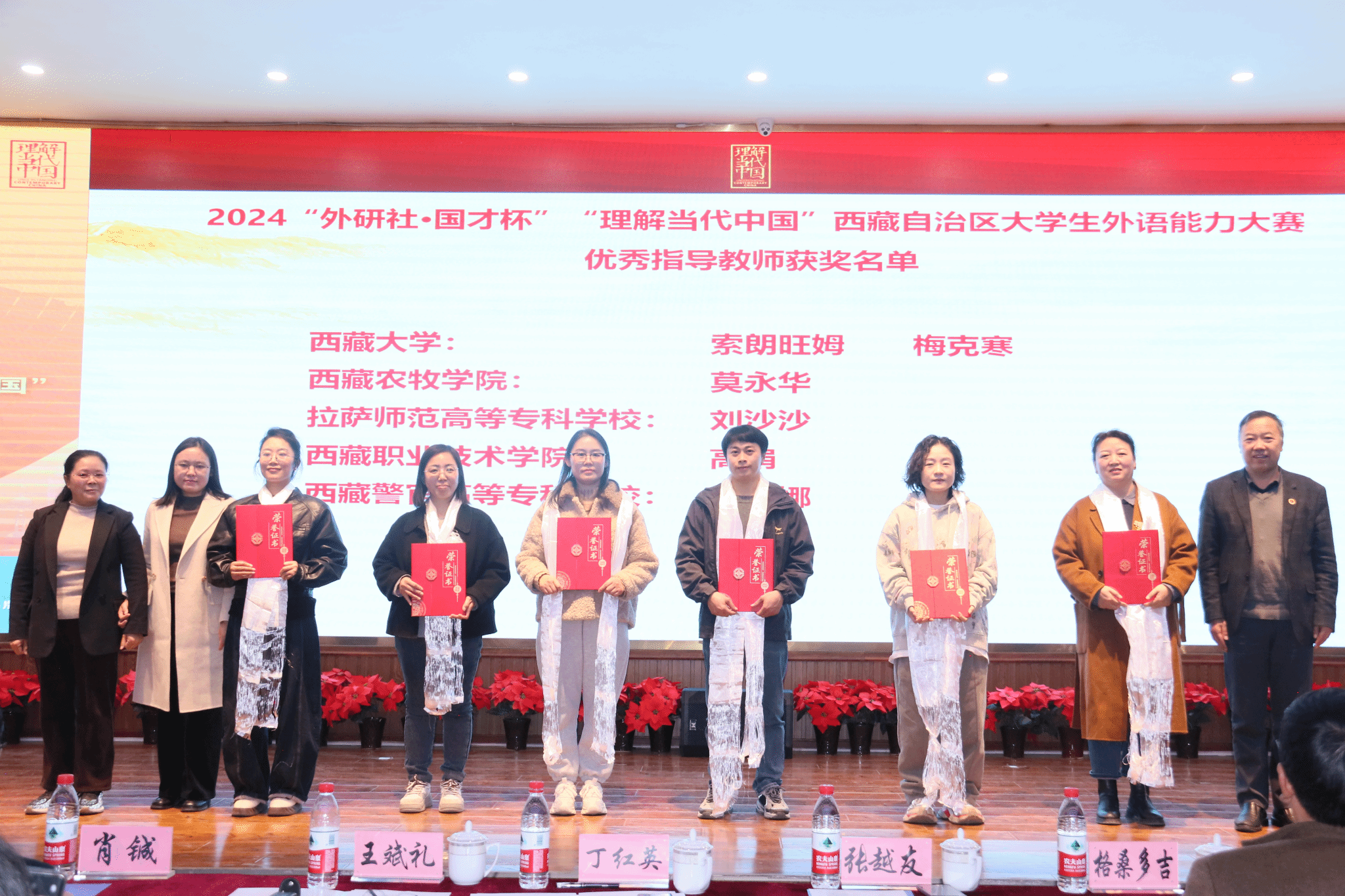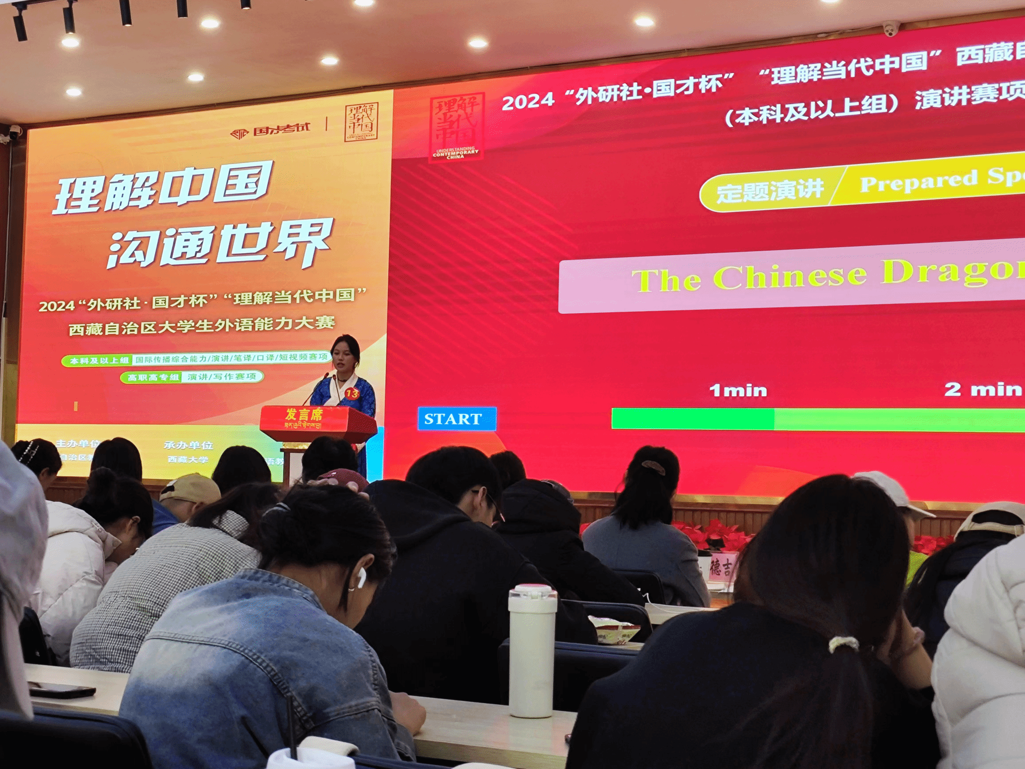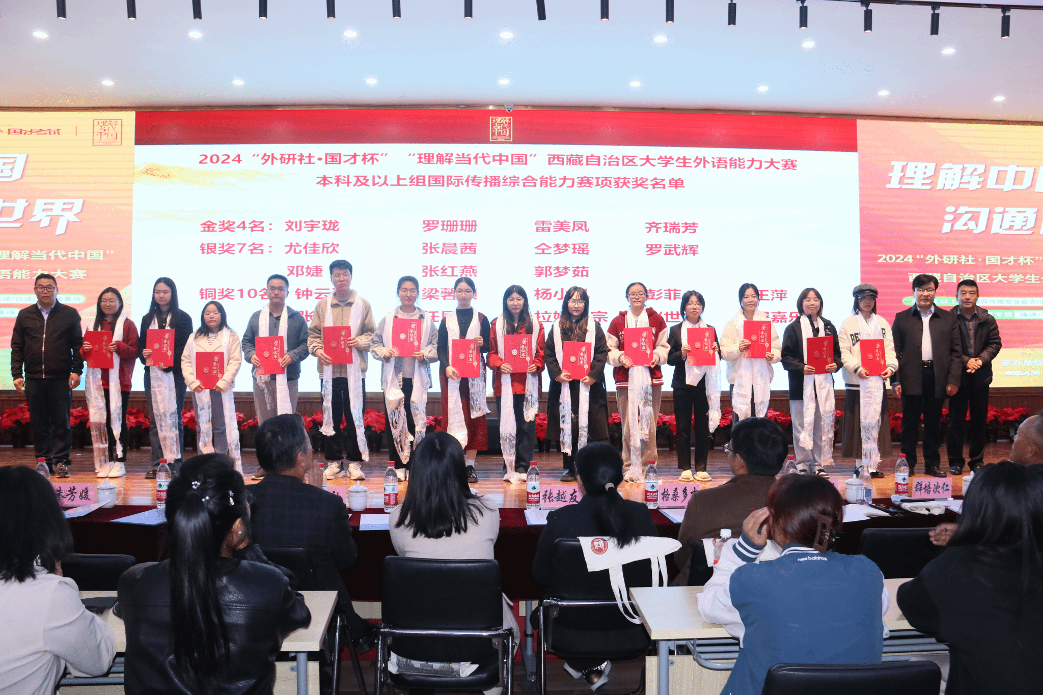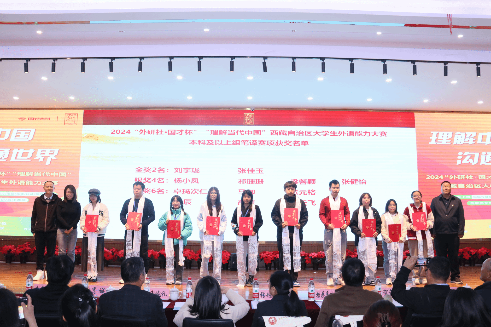 11月2日——3日由西藏自治区教育厅主办、西藏大学承办的2024年“外研社·国才杯”“理解当代中国”西藏自治区大学生外语能力大赛中,我校22名同学晋级省赛,共斩获银奖2枚,铜奖14枚;其中张健怡等2名同学斩获笔译赛项银奖,钟云飞等5名同学斩获铜奖;钟诗语等6名同学斩获国际传播综合能力赛项铜奖;施吉仙等5名同学斩获演讲赛项铜奖。本次竞赛,我校由公共教学部外语教研室莫永华、白雪和扎西旺珍3位老师带队,公共教学副书记、副主任贺玺浦应主委会邀请出席了颁奖典礼,莫永华老师被评为了优秀指导教师。