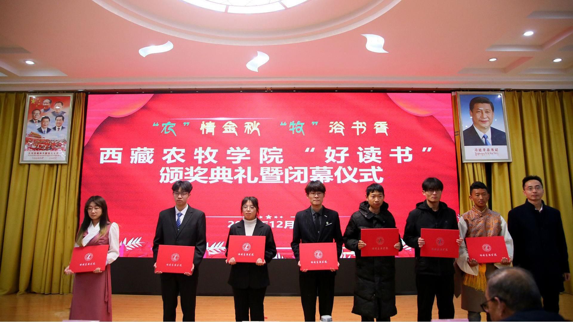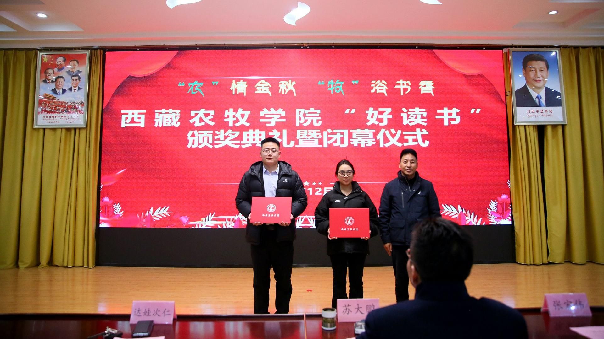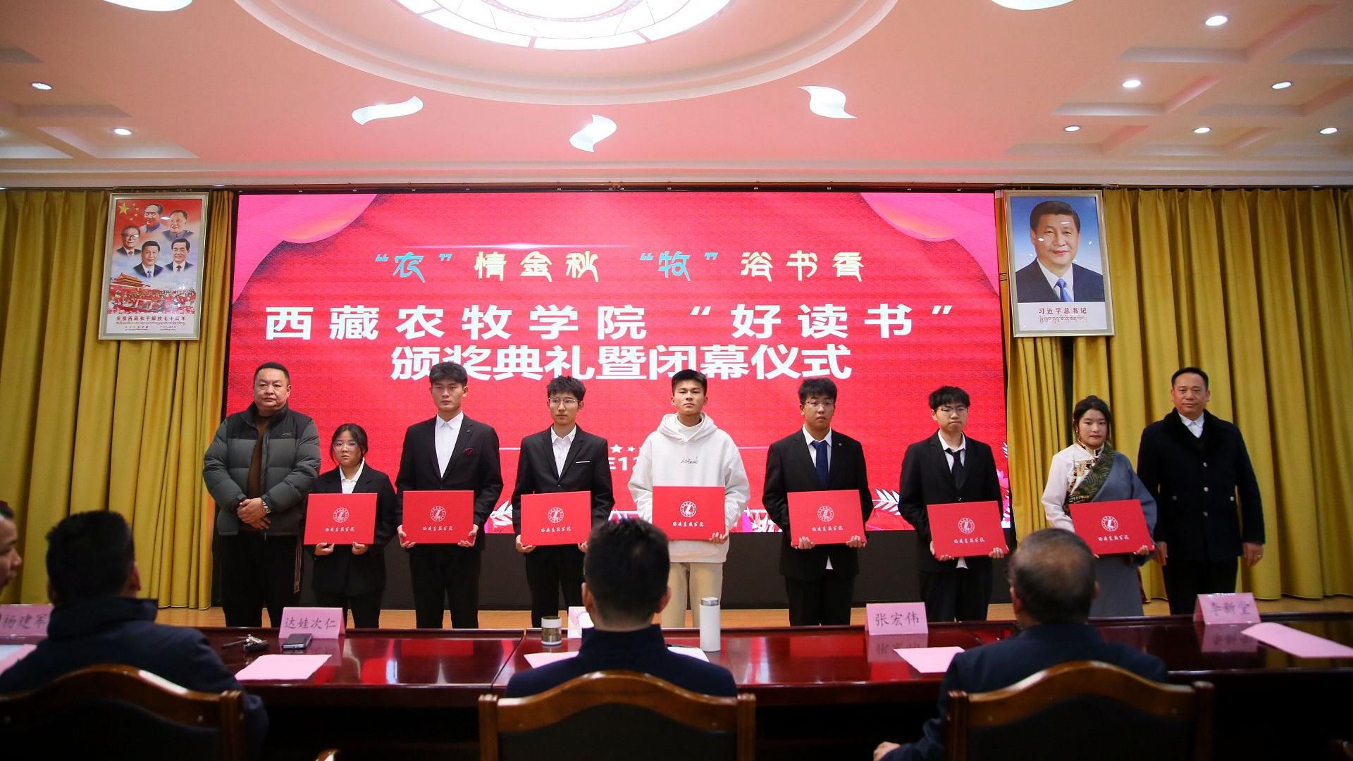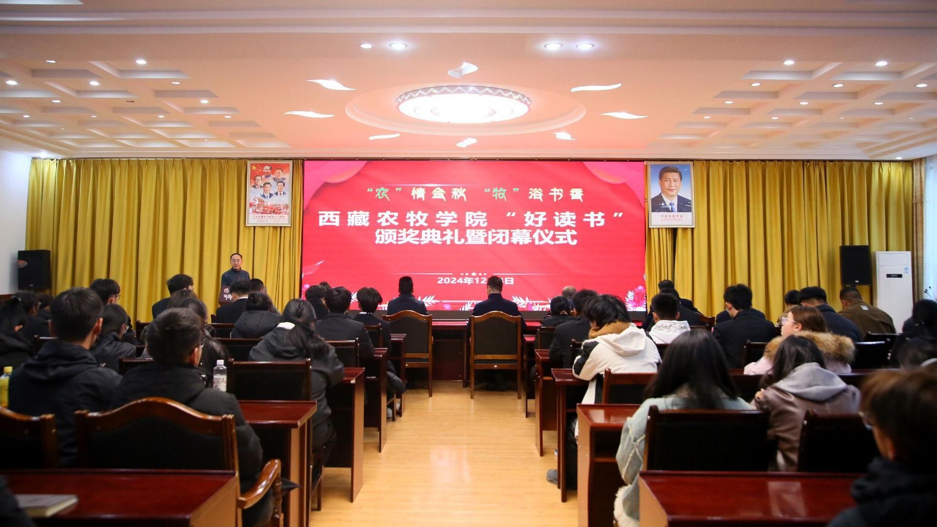 2024年12月4日下午,我校在一号行政楼3楼中心会议室举行2024年“好读书”奖学金和“好读书”系列活动颁奖典礼暨闭幕仪式。校党委副书记、副校长苏大鹏,校党委委员、宣传部部长达娃次仁、校图书馆馆长张宏伟,学生工作处及各二级学院学生工作分管领导,辅导员、学生代表共100余人参加仪式。仪式由学生工作处处长赵德军主持。