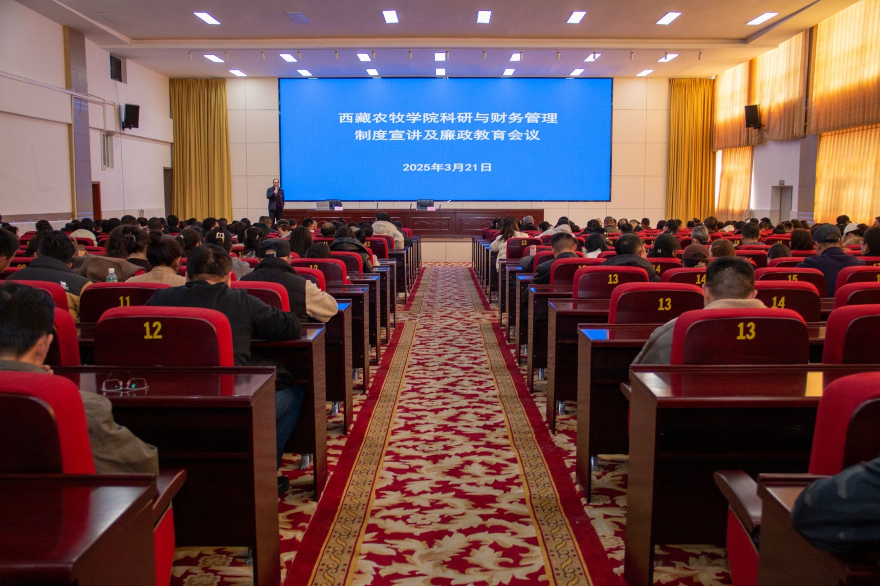 3月21日下午,为加强科研经费规范有效管理,筑牢廉政思想防线,西藏农牧学院召开科研与财务管理制度宣讲及廉政教育会议。此次会议由曹仲华副校长召集。科研处副处长李奇、计财处副处长尚涛进行了管理制度宣讲,纪检监察处副处长王元林作纪律提醒,全校中级职称以上科研人员和职能部门关键岗位科级干部250余人参加了此次会议并观看了警示教育片。