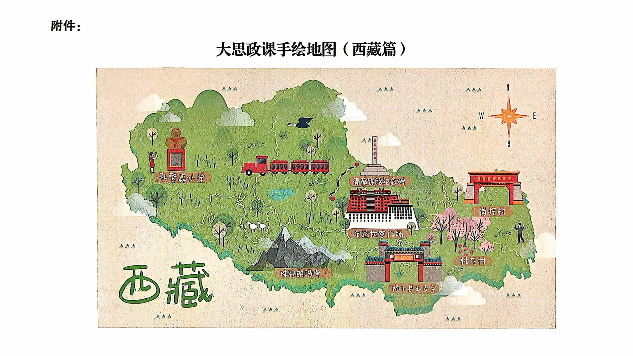 手绘地图元素活动,是教育部深入贯彻习近平总书记对学校思政课建设的重要指示精神,落实“打造一批‘大思政课’品牌”的重点任务,定期推出特色化、实物化、社交化、年轻化、网感化的实践教学成果,集中展现全国各地“大思政课”建设进展和育人成效的重要举措。我校手绘地图是由思想政治理论课教学创新团队、青马协会精心制作。该手绘地图基于《习近平新时代中国特色社会主义思想概论》第十二章“建设社会主义生态文明”,分析了西藏林芝嘎拉村与浙江“千万工程”的异同,归纳生态致富的共性经验,生动勾勒出嘎拉村从传统农牧业向生态旅游转型的历程和主要做法,阐释了生态文明建设与乡村振兴、民族团结、共同富裕的协同关系,充分展现了西藏“短短几十年,跨越上千年”的时代缩影。