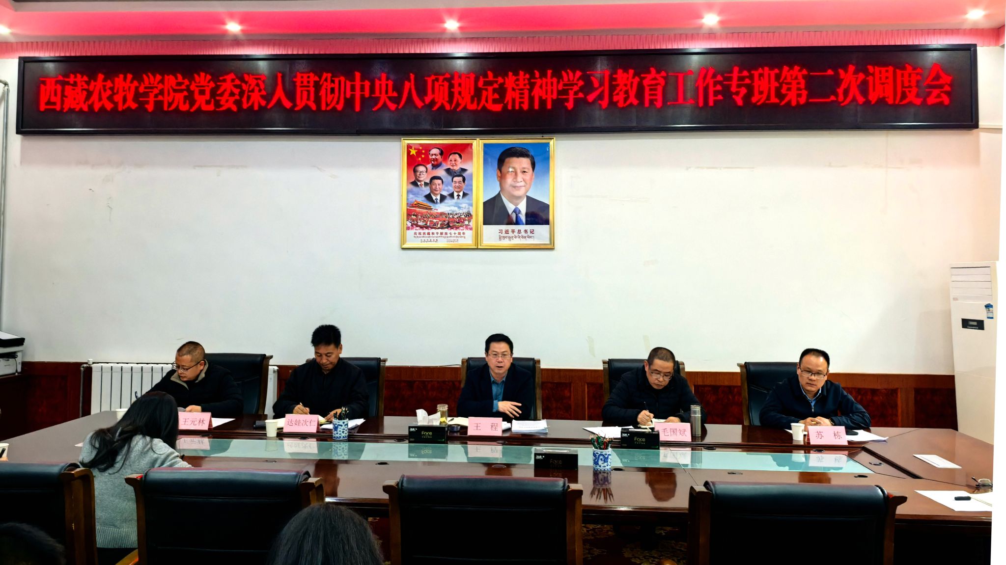 2025年4月29日,西藏农牧学院召开深入贯彻中央八项规定精神学习教育工作专班第二次调度会,传达学习中央层面学习教育工作专班有关问题答复精神,自治区党委常委、党委组织部部长赖蛟有关讲话精神,通报学习教育督导检查情况,进一步明确重点、压实责任、推动工作。校党委副书记、学习教育工作专班组长王程主持会议并讲话。