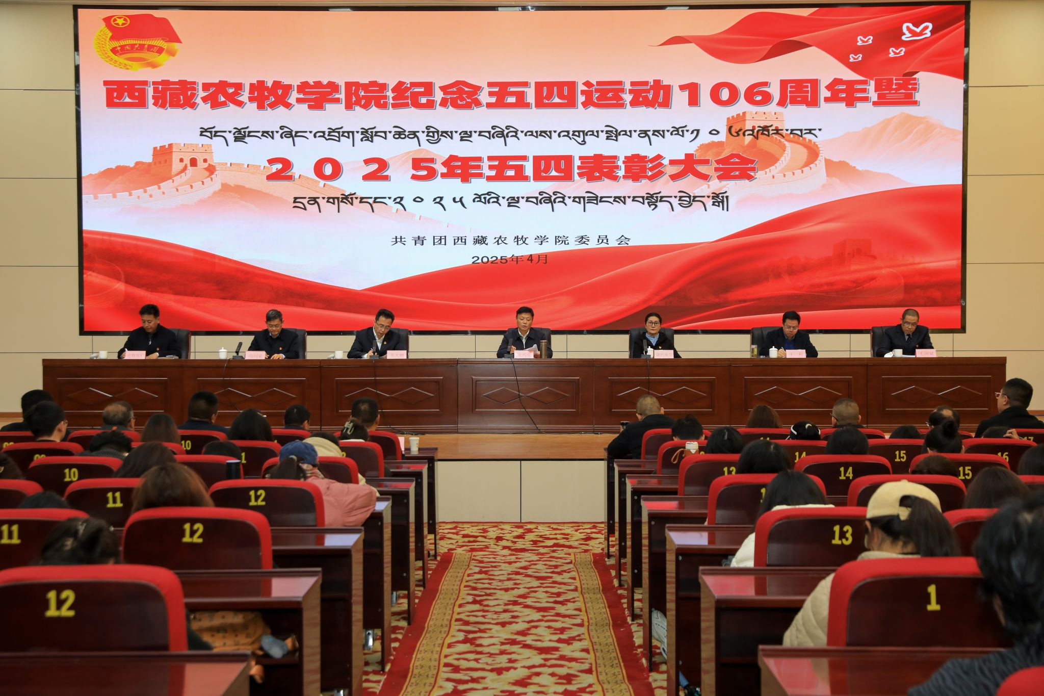 4月30日,西藏农牧学院纪念五四运动106周年暨2025年五四表彰大会隆重举行。校党委书记、副校长张兴堂,校党委副书记、校长强巴央宗,校党委副书记王程,校党委委员、副校长巩同梁,各县处级单位相关领导出席大会。会议由校党委副书记、副校长苏大鹏主持,获奖代表、师生代表400余人参会。