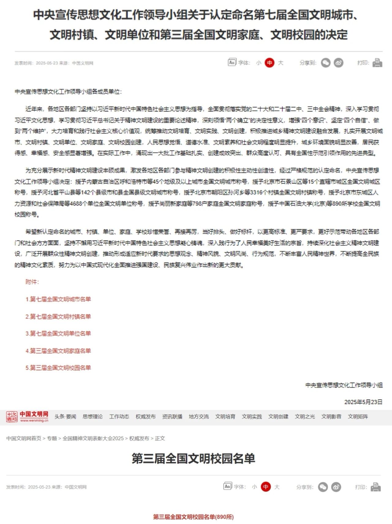 近日,中央宣传思想文化工作领导小组发布《关于认定命名第七届全国文明城市、文明村镇、文明单位和第三届全国文明家庭、文明校园的决定》。我校成功入选第三届全国文明校园,收获了办学历史上又一“国字号”荣誉。