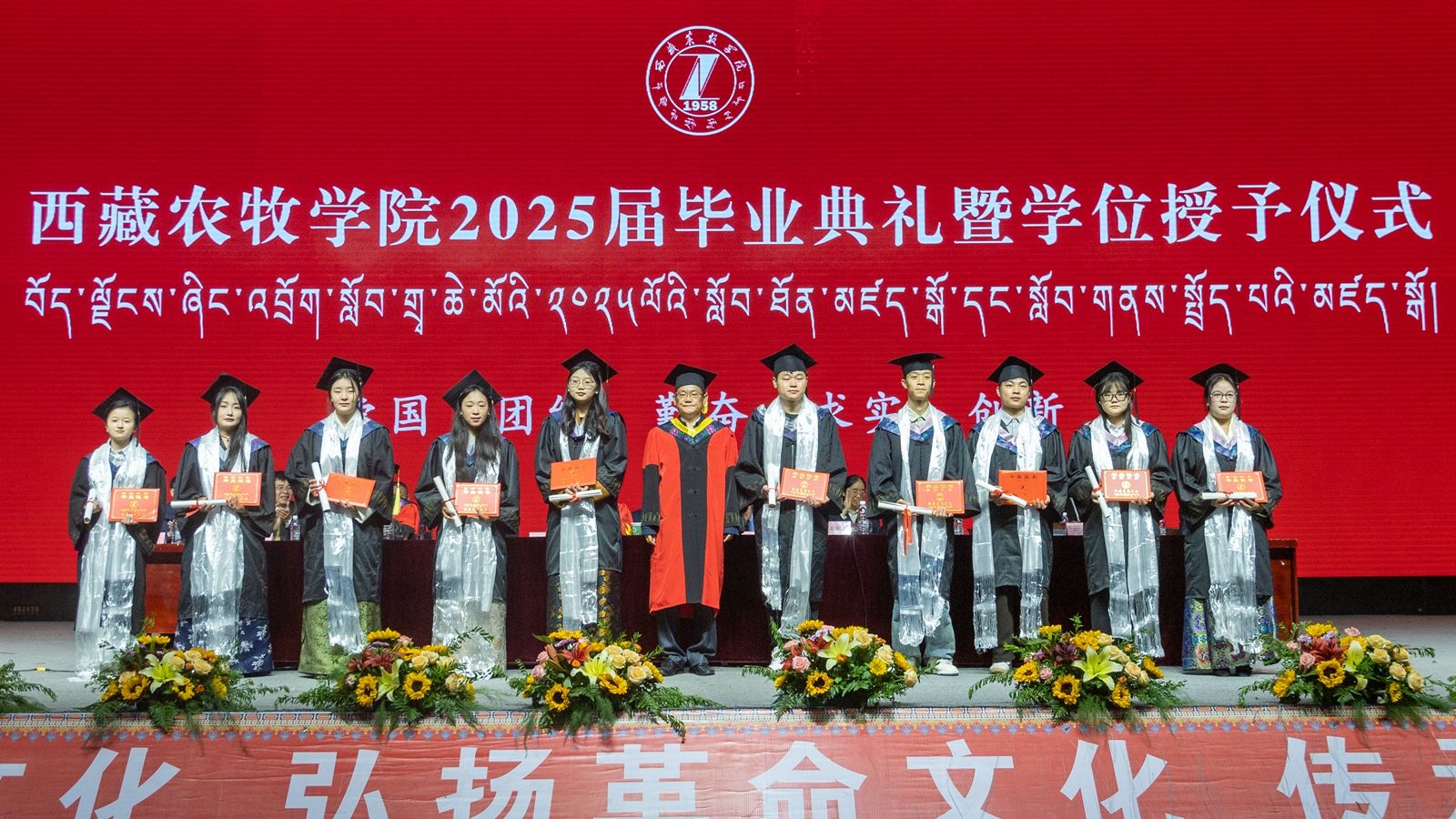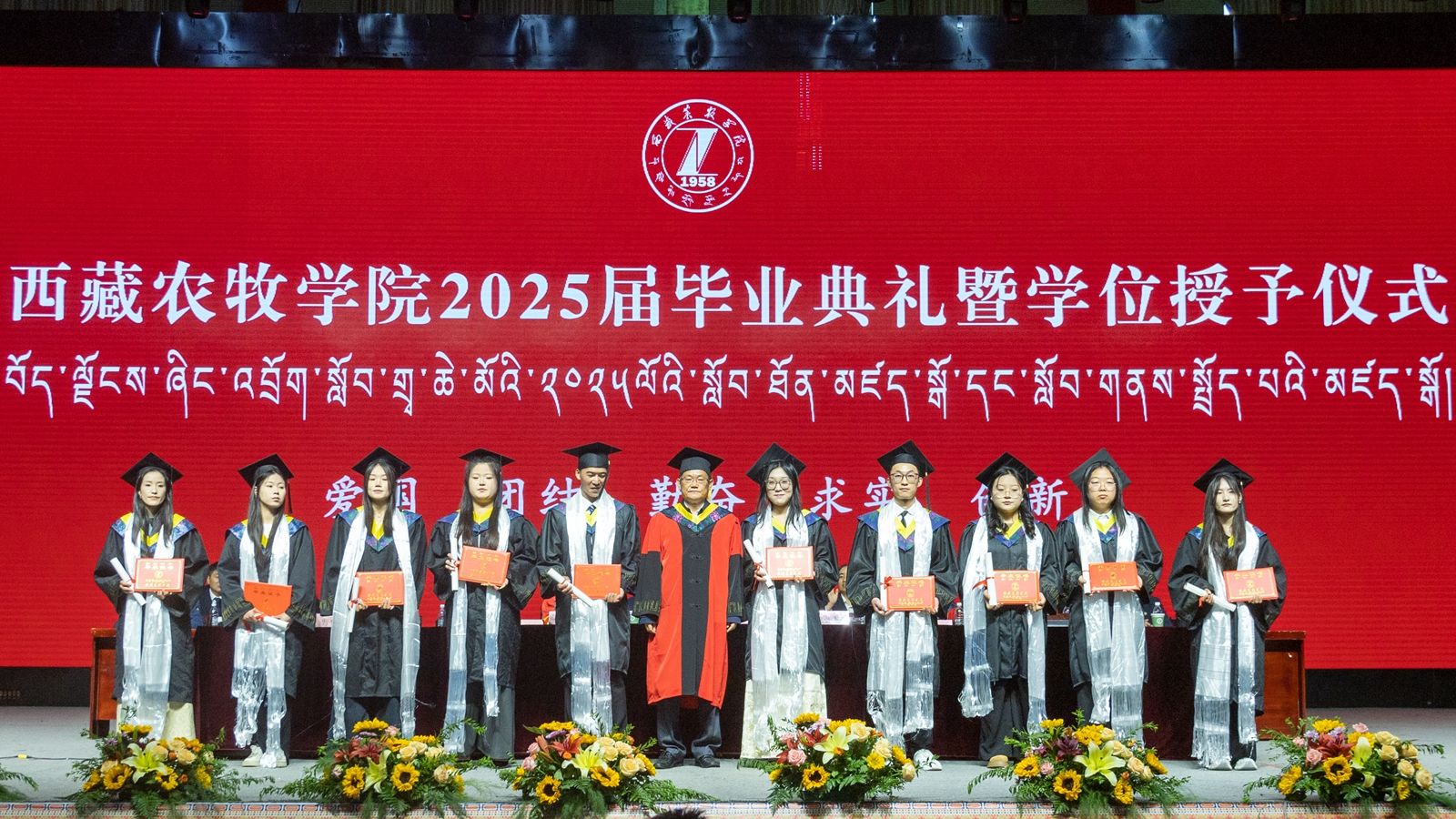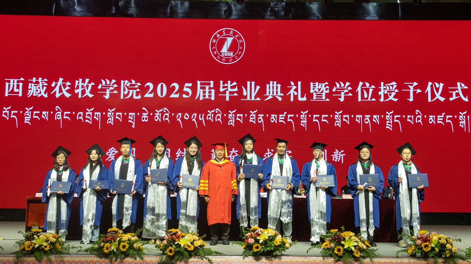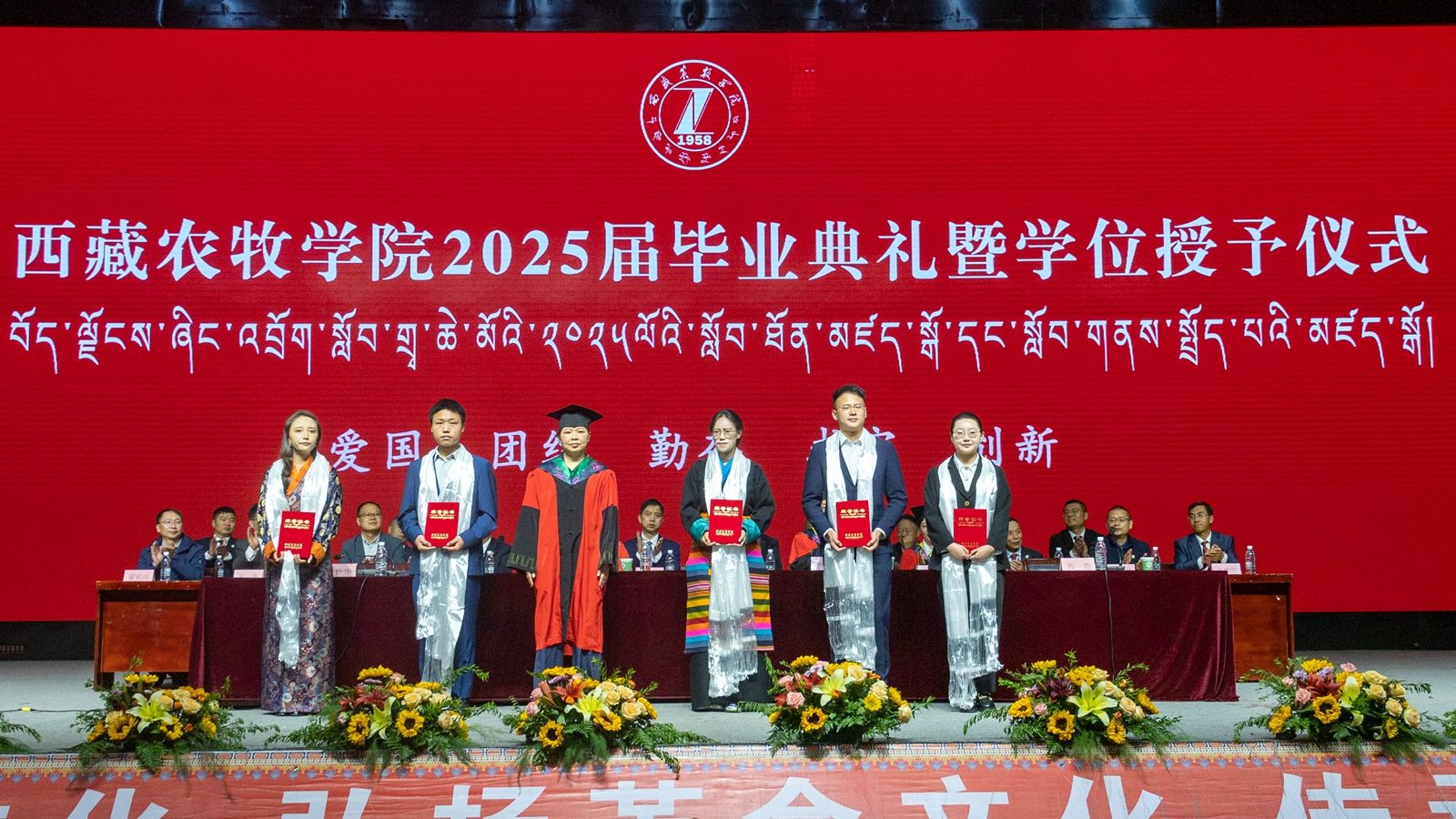 6月16日上午,西藏农牧学院2025届毕业典礼暨学位授予仪式在校文体馆举行。学校党委书记、副校长张兴堂,校党委委员、副校长巩同梁,校党委委员、副校长曹仲华,校党委委员、副校长邢震以及各职能部门、二级学院(部、所)负责人及教师代表、毕业生代表和在校生代表等1200余人共同见证和庆祝1810名本科生和275名研究生顺利毕业。